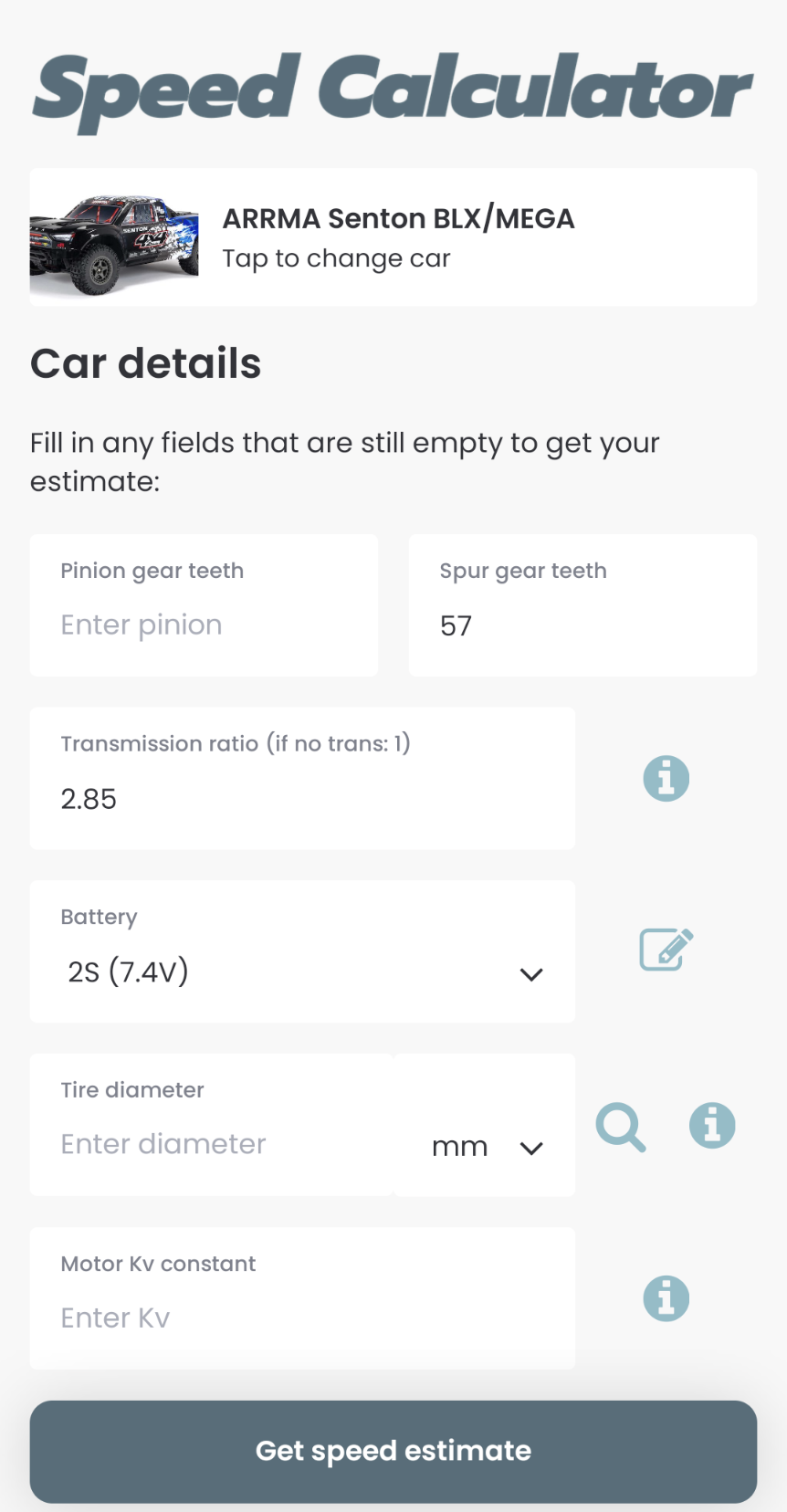Please note, the app's estimates are just that - estimates! They are based on perfect-world numbers, but in the real world there are a lot of variables. But, if you don't have a speed gun, RC Speed Calculator Pro should give a pretty good ballpark estimate.