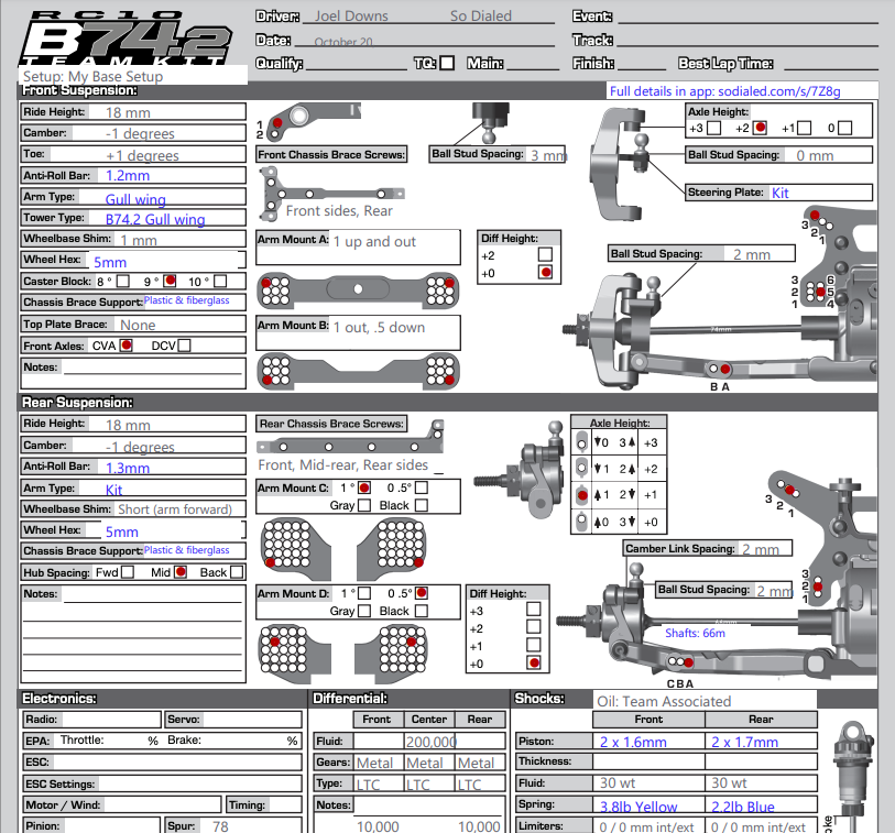 Cars that currently support Manufacturer Setup Sheets: Associated B6.4/D, B74.2/D, RC8 B4/E, XRAY X4 '22, TLR 8IGHT-X/E 2.0, and Tekno N/EB 48 2.1. We'll be adding more cars regularly, but note that we will focus on the newest and most popular cars. See full list of supported cars.