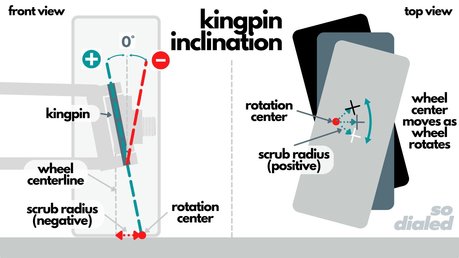 The kingpin will often lean inwards (towards the chassis) at the top, creating kingpin inclination. Inward lean is a positive inclination. This works with the scrub radius to affect the responsiveness and stability of the car.
