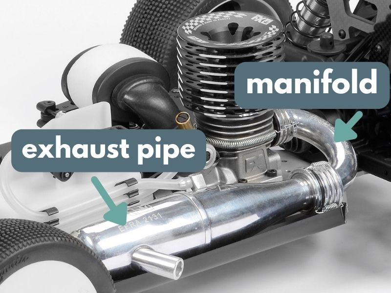 The exhaust manifold (aka "header") on an RC car engine is what channels the exhaust (after a combustion) away from the main cylinder out to the exhaust pipe (muffler.)