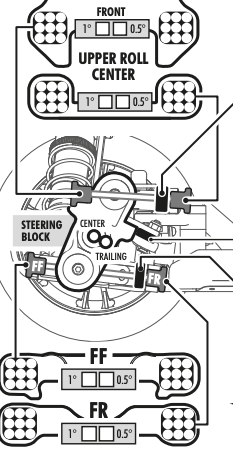 - Caster gain: move the front insert up or down and the rear insert the opposite direction or leave it at center. Depending on which way you tile the arm, up or down, the car will gain or lose caster as the suspension is compressed.